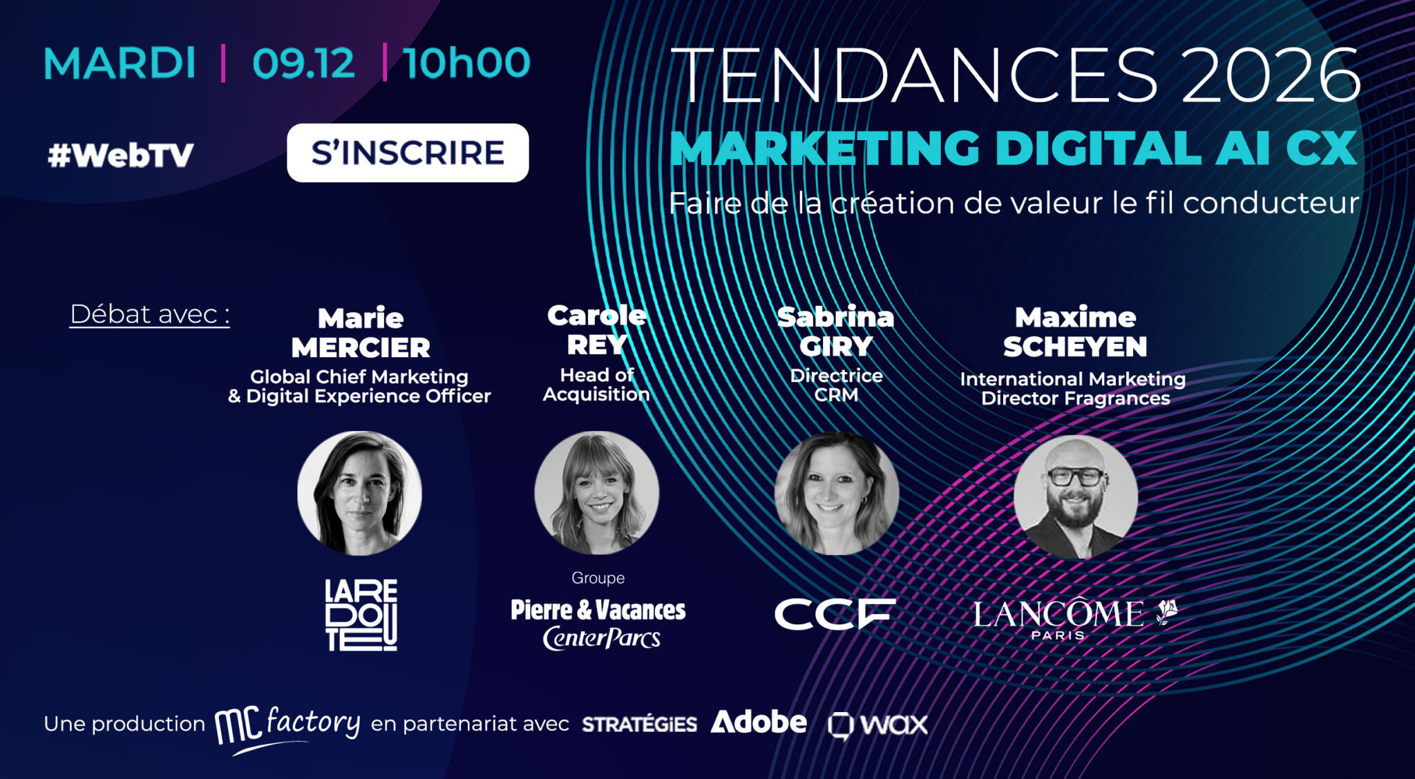 4 décideurs marketing, digital et expérience client interviendront sur ce débat pour éclairer les tendances qui transformeront leur secteur, lors de cette 92ème émission « Innovation & Cross-média ». Un débat avec La Redoute, Banque CCF, Lancôme et le Groupe Pierre & Vacances Center Parcs. Une émission produite par MC Factory en partenariat avec Stratégies, Adobe et Wax.