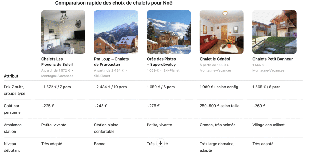 A la question « Meilleur séjour au ski pour les vacances de Noel 2025 en France », et après avoir qualifié le besoin (type de logement, ambiance recherchée, niveau de ski…), Shopping Research recommande une sélection de lieux.